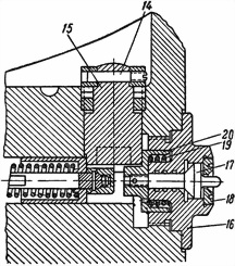 Ударный механизм состоит из корпуса бойка 16, бойка 17, упора 18, пружины бойка 19 и основания бойка 20, закрепленного штифтом от свинчивания.