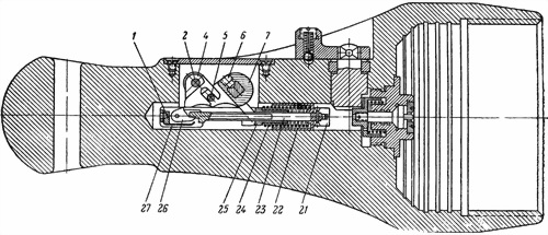 Ударник состоит из ползуна 23 с надетыми на него упорной втулкой 25, пружиной 24, ударной втулкой 22 и наконечником 21, который навинчен на ползун и закреплен штифтом. На другом конце ползуна укреплена на оси собачка 26, которая снизу поднимается пластинчатой пружиной 27; пружина к ползуну прикреплена винтом 28. Для надежности крепления пружины 27 под винт 28 подложена планка 1.