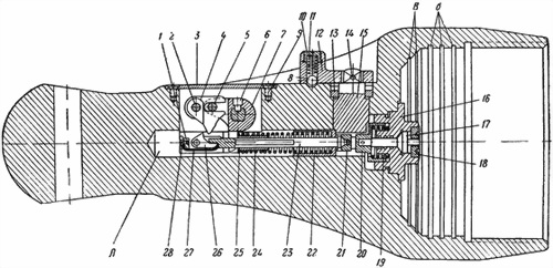 4 крючок (1-32); 5 палец рычага (1-35); 6 установочный винт (1-37); 7 рычаг (1-34); 8 шарик (1-21); 9 винт (1-39); 10 пружина ручки (1-22); 11 специальный винт (1-23); 12 ручка переключателя (1-20); 13 резьбовое кольцо (1-19); 14 винт (1-82); 15 переключатель (1-81); 16 корпус бойка (1-27); 17 боек (1-28); 18 упор (1-31); 19 пружина бойка (1-29); 20 основание бойка (1-88); 21 наконечник ударника (1-12); 22 ударная втулка (1-11); 23 ползун (13); 24 пружина ударника (1-10); 25 упорная втулка (19); 26 собачка (14); 27 пружина (16); 28 винт (18); б канавки; в уступы; л канал