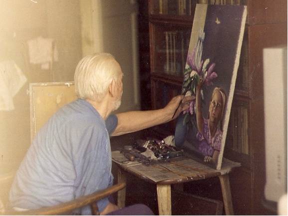 Папа пишет картину левой рукой после инсульта. Фото 2003 год.