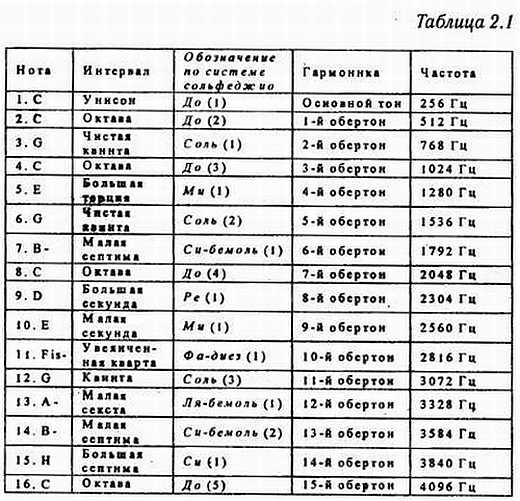 В первом столбце приведены наименования тонов. Во втором интервалы между основным тоном и гармоникой. В третьем наименования тонов, принятые в сольфеджио, в скобках же указано, сколько раз появляется данная гармоника. В четвертом столбце вы найдете нумерацию гармоник по степени удаленности от основного тона. В пятом частоту образуемых обертонов.