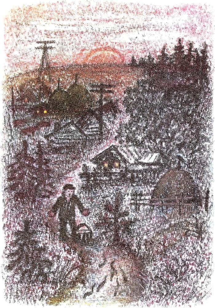 У самой деревни вдруг почувствовал, что корзина стала очень уж лёгкой. Заглянул в неё и ахнул: ни одного вьюна! Что за чудо? Глядь назад, а на дороге в пыли барахтается что-то. Подошёл. Вьюн! Вот те раз!..