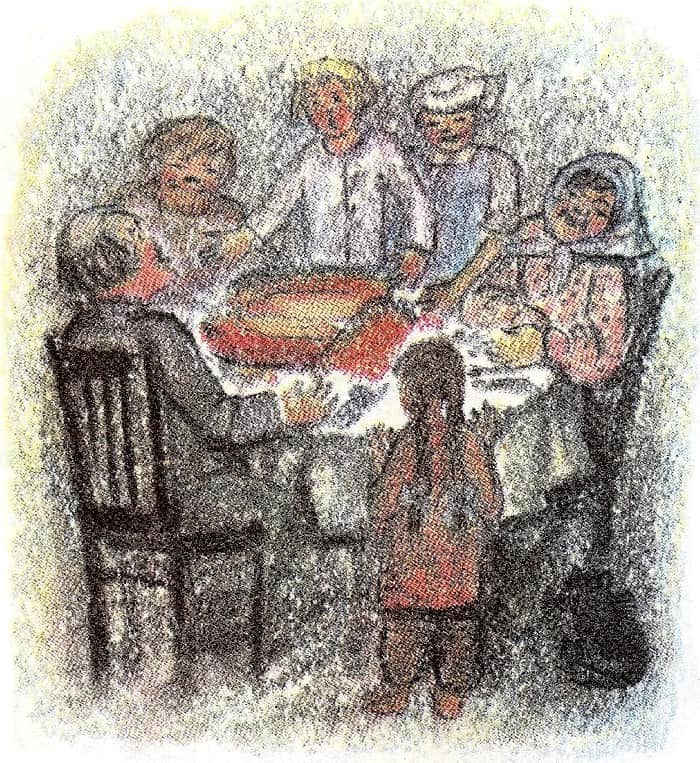Лёнька взял нож и, сияя, раскрыл пирог. А в нём пусто. Раскрыл второй, третий рыбник тоже пустые. Кто-то из гостей ну потешаться: