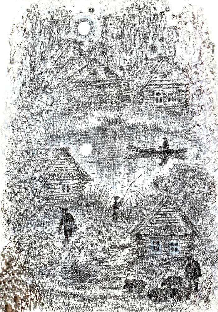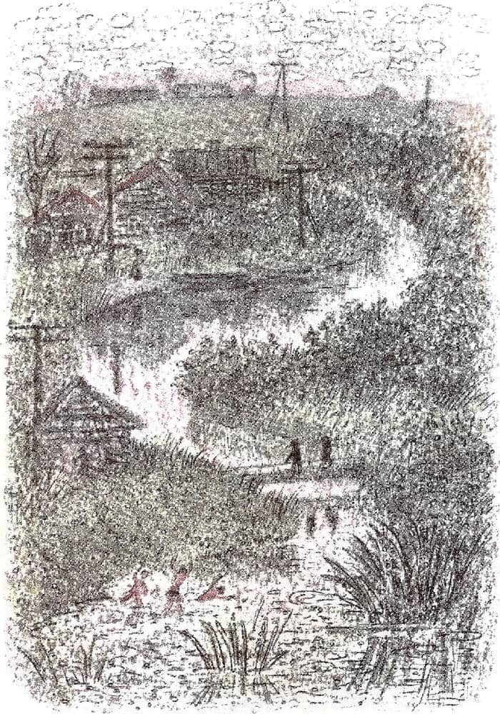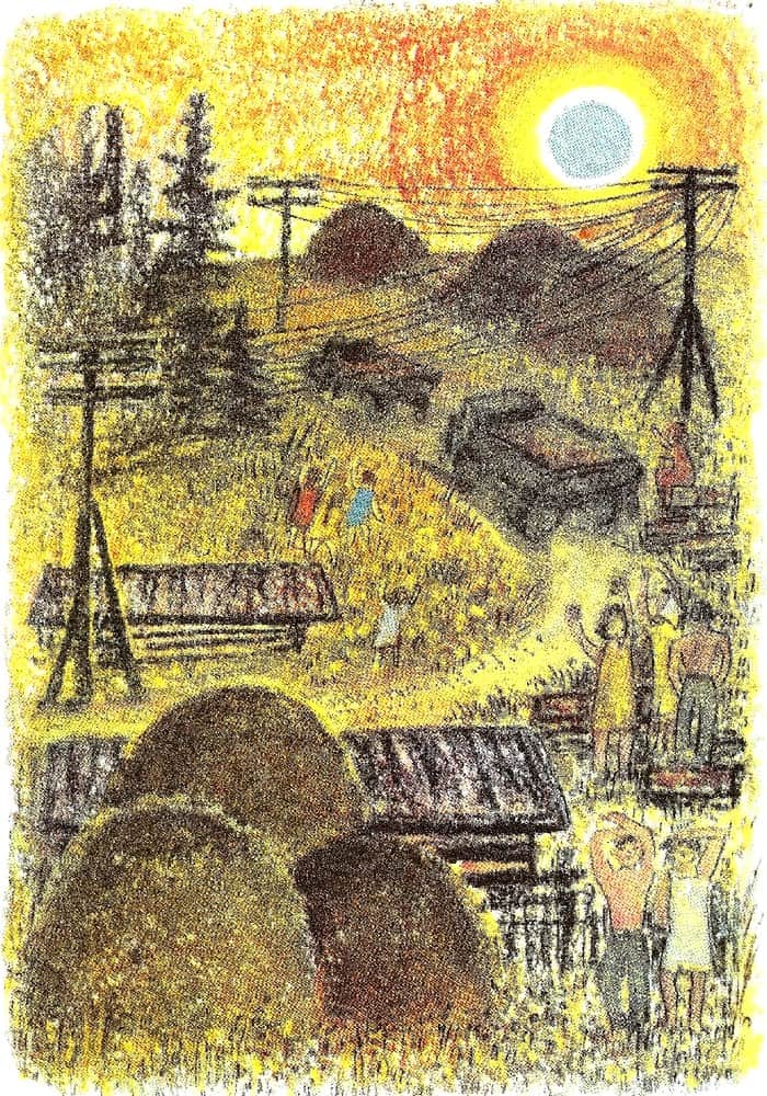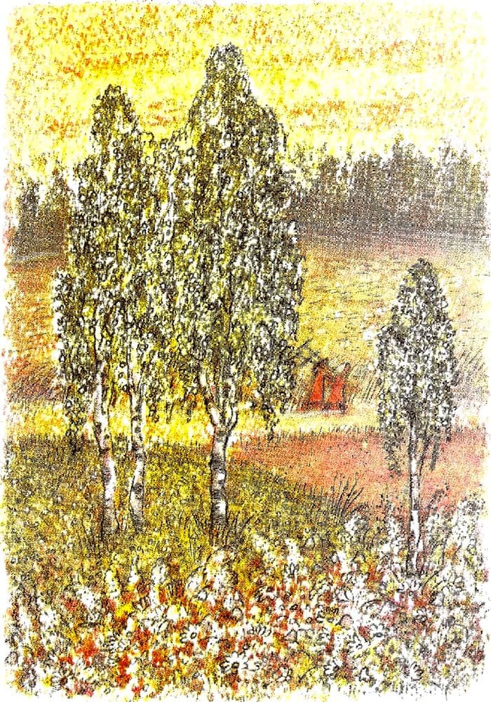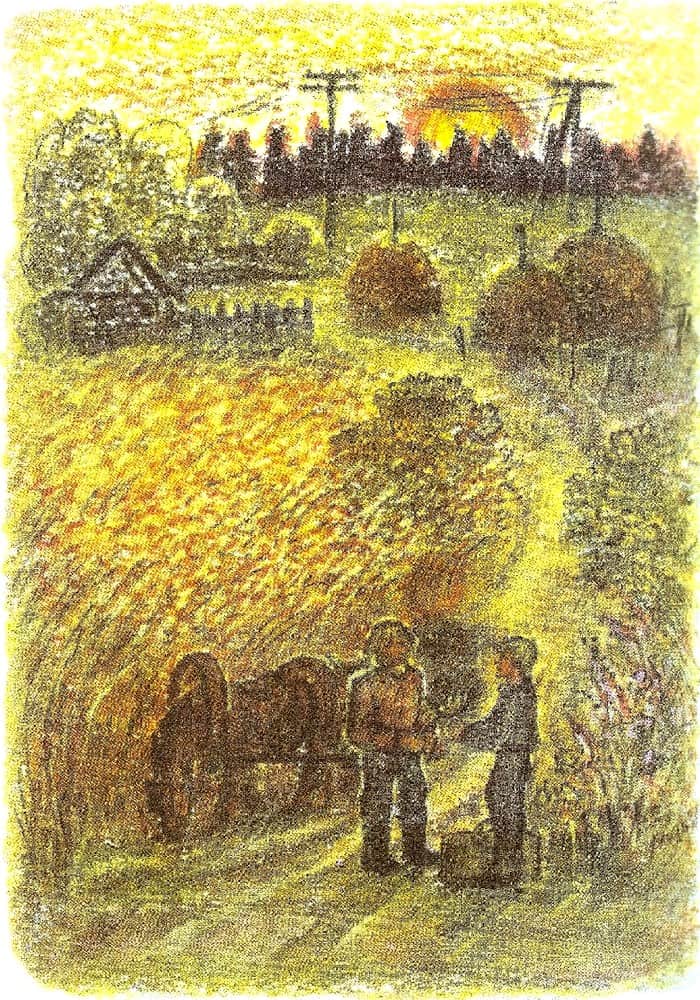 Вечерело. Солнце медленно катилось по кромке леса, бросая на рябь реки красный пояс заката. В кустах кое-где щебетали иволги. От стогов тянуло клевером.