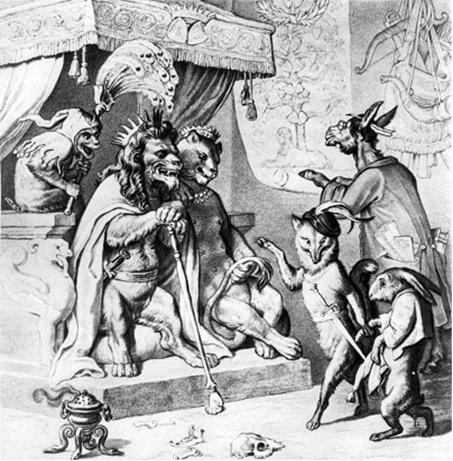 Сам же король, обращаясь к Рейнеке, молвил: «Простите,