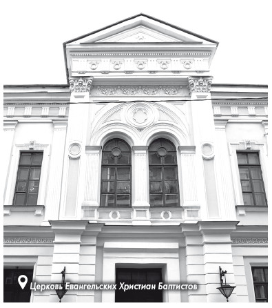напротив, на противоположной стороне Малого Трёхсвятительского переулка, находится Московская Центральная Церковь Евангельских Христиан Баптистов. Фасад этой церкви настолько незаметный, что непосвящённые проходят мимо, даже не подозревая об историческом объекте. А церковь старая, с историей. На её месте стояла старинная реформатская церковь, построенная ещё при Петре Первом. Эту церковь в петровские времена посещали жившие в Москве голландцы и англичане. Позднее церковь передали баптистам.