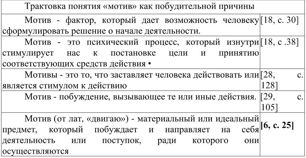 На основе существующих у человека потребностей формируются мотивы. Анализ работ многочисленных авторов позволяет отметить отсутствие единого подхода к трактовке понятия. Мотивами часто называются побуждения, причины поведения, представления и идеи, потребности и влечения, состояния и свойства личности, предметы внешнего мира, установки, волевые импульсы.