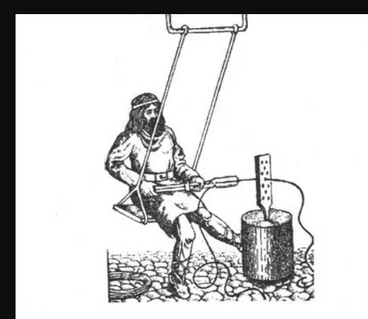 Именно так это и выглядело. Подмастерье упирался двумя ногами в пару специальных столбов, захватывал щипцами проволоку, отталкивался и-и-и отлетал на от волочильной доски. Там он выпускал проволоку, и движение качелей возвращало его на исходную позицию. Цикл повторялся[4].
