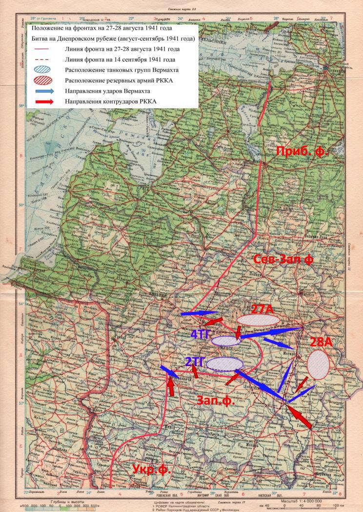 А тут еще так получилось, что я встретил её, Маргариту, мою Марго! 22 июня 1941 года война не началась, а у нас в этот день родилась дочка, которую мы назвали Викторией. Но оттянуть войну удалось лишь до третьего августа, хотя моей задачей было постараться оттянуть войну на год. Да, заготовки пошли в ход, причем достаточно удачно, но причины, которые заставили Гитлера напасть в сорок первом году были слишком серьезными, поэтому совершенно отложить войну не получилось. О событиях начала войны я рассказал уже достаточно подробно. Последняя попытка решить все одним, точнее, двумя мощными ударами пришлась на конец августа начало сентября. В это время бои развернулись на Днепровских рубежах от Могилева до Черкасс. Я получил назначение командующим Могилевского фронта. Моим соседом справа был Жуков, слева Тимошенко, фактически, из-за разрыва между фронтами Северо-Западным (Жукова) и Западным (Тимошенко) и пришлось из частей Резервного фронта создавать Могилевский фронт, главной задачей которого было затормозить движение двух танковых групп на Москву, причем, направление на Смоленск оказалось не самым приоритетным, основные усилия Быстроходный Гейнц направил на Орел, стараясь создать угрозу окружения двух фронтов на Украине.