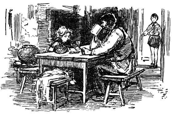 За столом сидела Фимка, держа в руке огромный ломоть хлеба, а Сергей Семёнович старик с чёрным лицом пил из большой кружки квас.