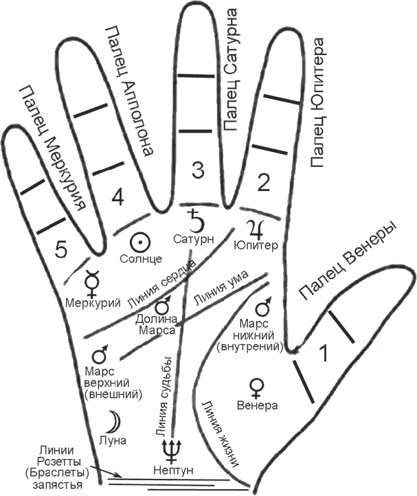 Напомним, что 7 планет, которыми назвали бугорки на ладони (рис. 31), это те планеты, которые в силу их большой величины или ближайшего расположения к Земле видно при нормальном зрении без оптических приборов. Считается, что они оказывают на планету Земля и ее обитателей большое влияние, а дальние планеты, которые тоже видны россыпью на ночном небе в связи с их бесконечной удаленностью или небольшим размером, менее активно воздействуют на человека своей планетарной энергией.