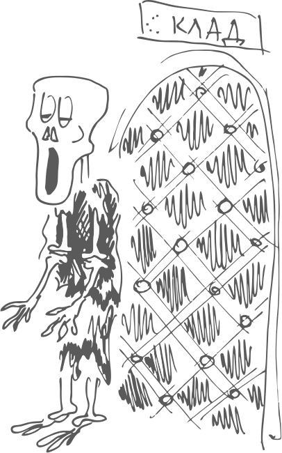 Не откроешь КлАДА дВЕРь,Охраняет КАДАВЕР!При жизни был болтлив и глупТвердил: «Войдешь через мой ТРУП».Теперь и в ночь, и день-деньскойНа службе зомби часовой.