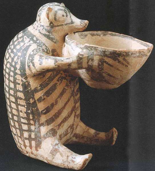 Данное животное держит сосуд с ритуальным подношением богам. Логика древнего человека, как предполагают ученые, была такова: звери, как и люди, молят о плодородии, защите от природных бедствий, нападений и неудач. Общий силуэт, как и монохромный геометрический орнамент, довольно прост и относится к самому раннему этапу развития искусства в этом регионе.