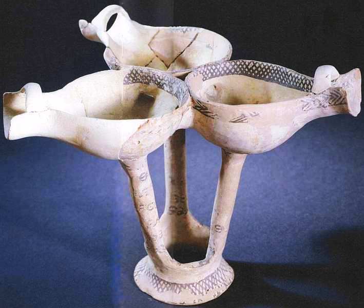 Датировка данного произведения очень широка. Дело в том, что именно в этот период кикладская керамика получила свое оформление, в том числе благодаря активному влиянию на местные ремесла более развитых минойской и микенской цивилизаций. Поскольку это изделие может быть ранней репликой минойской утвари или более поздним местным произведением, ученым очень сложно определить точные рамки датировки. Трехчастный характер вазы указывает на то, что ее вряд ли использовали в быту. Скорее всего, она предназначалась для ритуалов в честь богов или использовалась во время похоронных обрядов (в сосуды помещали символическую жертву и оставляли в святилище или на захоронении). На экспонате остались следы оригинального декора. Это достаточно простые геометрические линии, образующие орнамент в нижней части вазы, имеющей сложную конструкцию. На ножки нанесены условные знаки и эмблемы, о значении которых можно только строить догадки.
