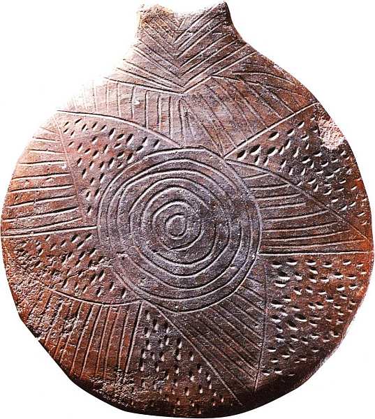 Различают несколько распространенных мотивов: солярный знак (солнечный) и спиральный узор в виде звезд и морских лодок. Часто орнаменты обыгрывали образ женского лобкового треугольника. На представленном экспонате изображены солнце или звезда.