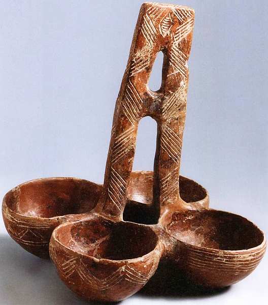по центру, напоминает узкие полосы материи, которой, возможно, обматывали эту часть сосуда. Позже ленты трансформировались в условное декоративное изображение.