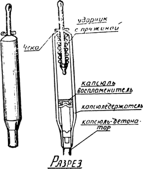 Упрощенный взрыватель УВ это цилиндр, внутри которого имеется ударник, накалывающий при помощи пружинки капсюль-воспламенитель. Пружинка приходит в действие, как только будет выдернута предохранительная чека (рис. 5).
