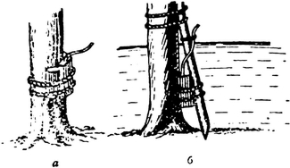 Взрывая мост, располагай заряды в нескольких местах (на сваях опор, на пролетных сооружениях). Соедини заряды между собой детонирующим шнуром или при подрывании электрическим способом сетью проводов. Помни, что невзорванные опоры облегчат врагу восстановление моста. Как прикреплять взрывчатые вещества к деревьям-сваям и столбам, смотри на рисунке 12.