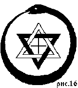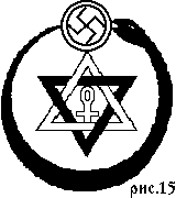 Здесь мы видим все ту же печать Соломона и символического змея. Разница между ними лишь в знаке, помещенном в центр звезды, и включенном в рисунок новом символе свастике или сууастике (рис. 15).