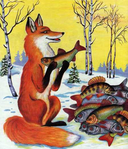 А лисичка собрала всю разбросанную по дороге рыбу, села и ест себе. Навстречу ей идёт волк:
