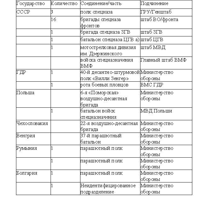 Таблица 4. Подчиненность имеющихся в наличии сил, пригодных для специальных операций (в конце 1989 года)