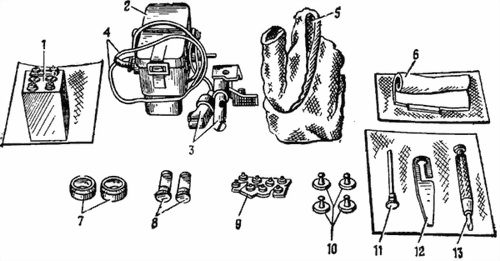 1 аккумуляторная батарея 2КНБН 1,5; 2 корпус системы освещения; 3 патроны подсветки; 4 провода; 5 чехол для системы освещения; 6 салфетка; 7 светофильтры; 8 ампулы в оправе; 9 лампочки; 10 колпачки; 11 ключ; 12 ключ-отвертка; 13 отвертка