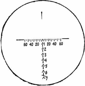 Влево и вправо от верхнего угольника находится шкала боковых поправок, равная ±0-60. Цена делений этой шкалы равна пяти тысячным (0-05). Она обозначена цифрами 20, 40, 60.