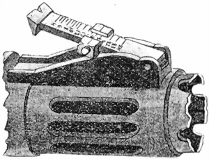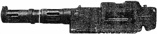 6. По всей длинѣ кожуха, для облегченiя его и для охлажденiя ствола во время стрѣльбы, сдѣланы продолговатыя отверстiя, а внизу кожуха имѣются, кромѣ того, двѣ круглыя дыры для того, чтобы можно было вставить отвертку для отвинчиванiя винтовъ, прикрѣпляющихъ прицѣльную колодку къ кожуху.