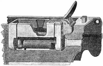 Въ прiемникѣ, сверху, окно для вставленiя обоймы съ патронами. Чтобы обойма крѣпко держалась въ прiемникѣ, въ задней стѣнкѣ его помѣщена защелка со спиральной пружиной (фиг. 18), а въ передней стѣнкѣ сдѣланъ вырѣзъ для помѣщенiя выступа обоймы. Для шпильки защелки въ задней стѣнкѣ прiемника двѣ дыры .