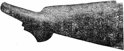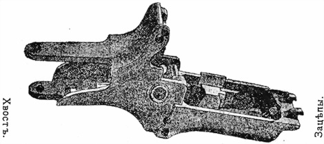 Сзади замочная коробка имѣетъ два хвоста , между которыми помѣщается шейка приклада. Замочная коробка соединяется съ прикладомъ посредствомъ хвостового винта (фиг. 42). Въ нижнемъ хвостѣ имѣется щель для помѣщенiя упора.