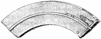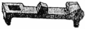 64. Ползунъ служитъ (фиг. 54) для опусканiя шептала внизъ, для производства одиночнаго выстрѣла. Онъ имѣетъ дыру для шпильки, которая соединяется со спусковымъ крючкомъ; въ средней части имѣется зарѣзъ , которымъ онъ заскакиваетъ за шептало. На заднюю плоскость ползуна упирается выступъ возвратнаго рычага, который при вращенiи рычага назадъ отводитъ ползунъ впередъ и тѣмъ расцѣпляетъ его съ шепталомъ. Сзади, внизу имѣется ушко для прикрѣпленiя конца спиральной пружины, соединяющей ползунъ съ шепталомъ.