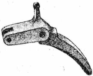 63. Спусковой крючекъ (фиг. 53) служитъ для опусканiя ползуна и тѣмъ для спусканiя курка съ боевого взвода. Онъ имѣетъ спереди проушины для соединенiя съ ползуномъ посредствомъ шпильки и сверху имѣетъ сосокъ , служащiй для передвиженiя впередъ и назадъ автоматическаго спуска. Снизу гнѣздо для конца спиральной пружины.
