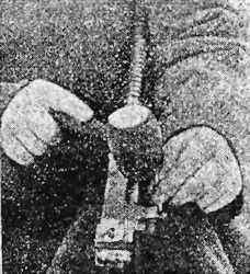 25) Вынуть возвратную пружину (фиг. 16), вставить приборъ-крючекъ въ замочную коробку сзади, наложить конецъ крючка на заплечики стержня пружины, упереть конецъ винта прибора въ выемку на хвостѣ замочной коробки и, вращая винтъ, придерживая лѣвой рукой крючекъ, сжать пружину настолько, чтобы переднiй конецъ стержня вышелъ изъ вырѣзовъ (проушинъ) рычага. Послѣ того осторожно подать приборъ съ крючкомъ переднимъ концомъ чуть кверху, чтобы конецъ стержня вышелъ окончательно изъ вырѣзовъ и, ослабляя винтъ, вращая его въ обратную сторону, отпустить пружину; послѣ того вытащить приборъ, вынуть стержень съ пружиной и снять пружину
