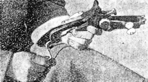 24) Вынуть боевую пружину. (фиг. 15). Пропустить приборъ-крючекъ спереди въ замочную коробку и захватить крючкомъ сверху за плечики стержня пружины. Надавить крючекъ, сжать боевую пружину, вывести конецъ стержня изъ за вырѣзовъ рычага и, поднять крючекъ и съ нимъ стержень немного вверхъ, затѣмъ осторожно отпустить пружину и снять крючекъ. Вынуть стержень и снять съ него пружину.