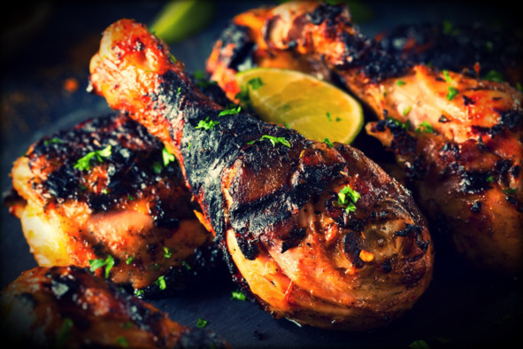 Разогреть гриль или барбекю. Обжаривать цыпленка в течение 1015 минут, периодически переворачивая. Убрать голени подальше от углей, закрыть крышкой и оставить