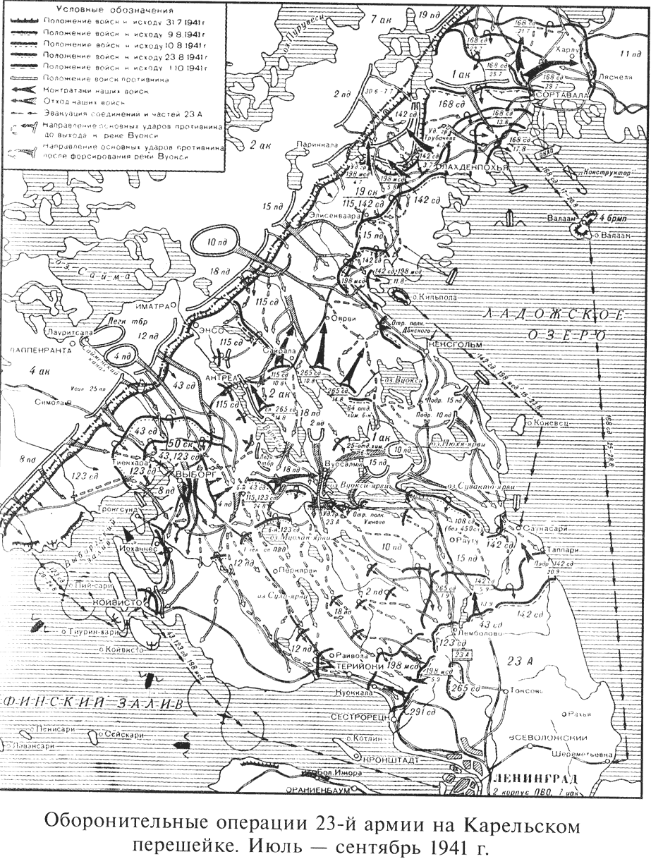 Положение советских войск на Карельском перешейке принципиально отличалось от положения финнов в декабре 1939 г. Большая протяжённость границы 1940 г. к северу от Ленинграда привела к тому, что советские дивизии 19-го стрелкового корпуса занимали оборону на широком фронте. Например, 142-я стрелковая дивизия прикрывала границу на фронте 59 км. Примыкавшая к её левому флангу 115-я стрелковая дивизия занимала фронт 47 км. Даже в условиях Карельского перешейка эти плотности были недостаточными для ведения эффективных оборонительных действий. 198-я моторизованная дивизия к тому моменту была дивизией скорее номинально, чем реально, поскольку была постепенно растащена на другие участки фронта. Танковый полк дивизии ещё в июле был переброшен на другое направление, 452-й мотострелковый полк убыл на олонецкое направление в Карелию. Осложнение обстановки на лужском направлении также вынудило снять с Карельского перешейка и отправить в район Луги 21-ю и 24-ю танковые дивизии, входившие в состав 10-го механизированного корпуса, лишив 23-ю армию крупных подвижных резервов. 6 августа 23-я армия стала кадровым донором генерал-лейтенант П. С. Пшёнников был назначен командующим 8-й армией. Вместо П. С. Пшенникова 23-ю армию возглавил М. Н. Герасимов, ранее командовавший 19-м стрелковым корпусом. Корпуса по директиве Ставки Верховного командования от 15 июля 1941 г. постепенно расформировывались, а их командование становилось ядром вновь создаваемых армейских управлений.