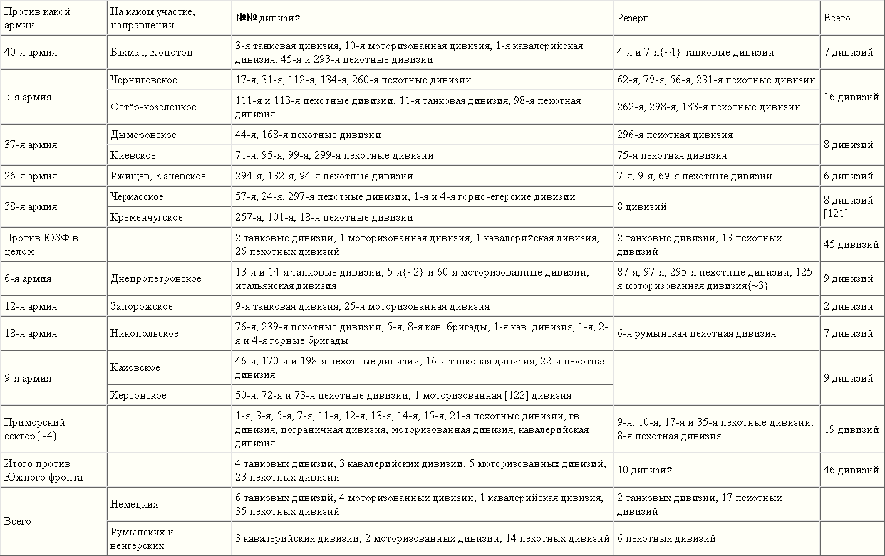 Если не считать явно завышенного количества дивизий, противостоящих Приморской армии, реальная обстановка на 1 сентября в целом соответствует приведённой таблице. В расположении сил противника просматривается группировка эшелона развития успеха, то есть танковых и моторизованных дивизий против Южного фронта в районе Днепропетровска и Запорожья.