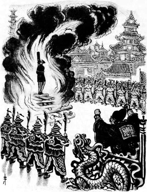 Но скоро дым рассеялся, и все увидели: посреди огня стоит Лю-второй и улыбается как ни в чём не бывало. Правитель чуть не задохнулся от ярости.