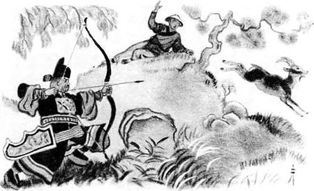 Однажды в те места, где жили братья Лю, приехал на охоту богатый и злой правитель области. На опушке леса он увидел стадо и мальчика-пастуха. Это был Лю-пятый. Возле него спала красивая горная козочка. Правитель схватил свой лук, прицелился в неё. Испуганный Лю крикнул козочка одним прыжком скрылась в лесу. Из чащи выглянул олень. Лю закричал ему на оленьем языке: «Спасайся!» и олень исчез. На поляну выскочили весёлые зайцы. Лю крикнул на заячьем языке и зайцы ускакали. Все звери попрятались, лес опустел. Напрасно правитель стрелял из лука только стрелы терял. Он был очень разгневан. А добрый Лю радовался, что успел помочь своим лесным друзьям.