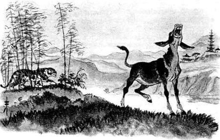Вскоре осла увидел тигр. Подумал, погадал и решил: «Этот большой, жирный зверь наверно, дракон. Очень уж длинные у него уши!» Спрягался в лесу и стал потихоньку поглядывать. Вдруг осёл поднял голову и закричал. Рёв раздался страшный. Тигр перепугался, отбежал подальше: думал, что осёл его съест. Долго сидел в кустах, дрожал от страха. Потом выглянул: осёл ходит по лугу, травку щиплет. Тигр приободрился, подполз ближе. Ничего не случилось! Тогда он вышел на поляну и мяукнул тихонько.
