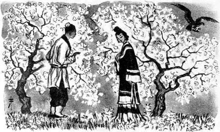 Ястреб летел всё дальше и дальше и наконец опустился в саду, где росли огромные, пышные хризантемы. В саду Хуан Сяо увидел среди цветов девушку необычайной красоты. Глянула она своими глубокими, как осенняя вода, очами на прекрасного юношу, и полюбили они друг друга.