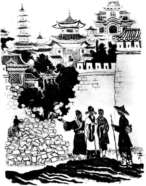 Шёл он, шёл, подошёл к большому городу и видит странное дело люди строят стену, а стена разваливается.