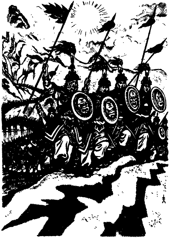 Тут взошло солнце. И увидел Лю на той стороне войско, как великан, стоит. Впереди войска отец. Шлем на нем блестит; на шлеме перья колышутся, как колосья бамбука. А рядом с отцом сосед его ближний, и другой сосед дальний, и весь народ.