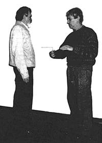 Поставьте испытуемого перед собой. Левую руку с открыто ладонью направьте в сторону этого человека как антенну. В правой руке, естественно, держите рамку. Задавайте вопрос: «Биополе этого человека составляет 30 см?» Если рамка отв тит утвердительно, задавайте следующий вопрос: «Биополе этого человека составляет 40 см?». И так до тех пор, пока рамка не прекратит давать положительный ответ. Таким образом вы замерили размер биополя человека.