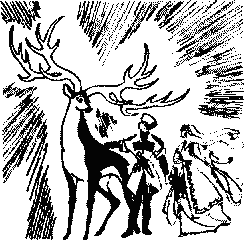Отвернул бедняк левый рог своего оленя и всякой едой и напитками наполнился широкий алдарский двор. Отвернул он правый рог и вышли из него столько юношей и девушек, что сосчитать нельзя. Заиграл сын бедняка на свирели и шумом пляски, звоном песни и веселыми криками наполнился широкий алдарский двор.