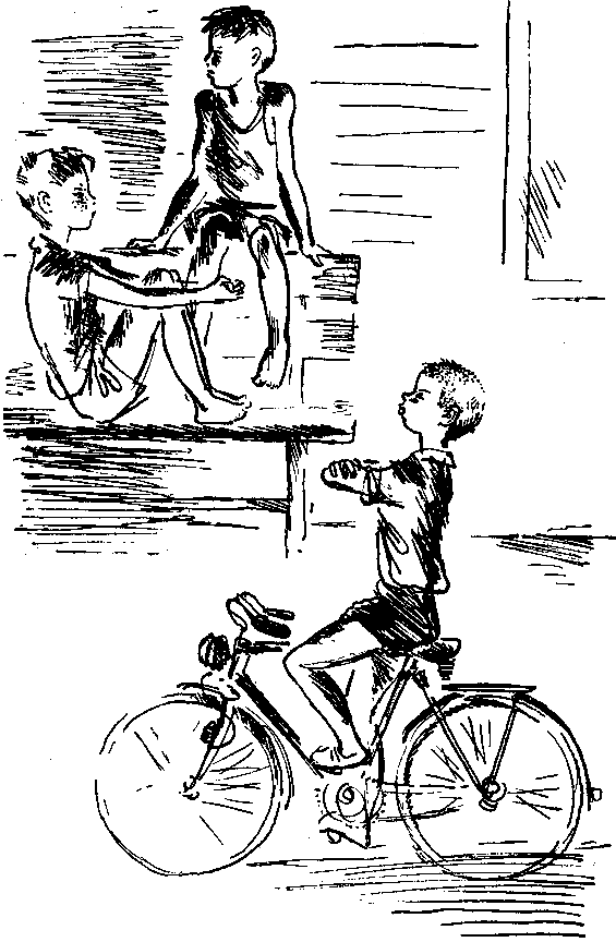 На дорожке перед домом катался на велосипеде стриженый мальчишка с большими оттопыренными ушами. Он разогнался, покатил прямо на Валерку, но вовремя затормозил и свернул в сторону. Потом начал фасонить. Ездил, расставив руки, клал ноги на руль, садился на багажник.