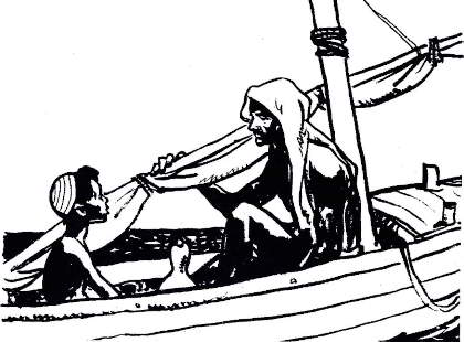 Али отпускал верёвку, считая развёртывающиеся круги. Так он определял глубину, на которой находился брат: двенадцать, тринадцать метров восемнадцать, девятнадцать Верёвка медленнее, но всё ещё опускалась в воду. Но вот два условных рывка и Али начал вытягивать камень. Когда Али подогнал лодку к вынырнувшему довольно далеко Хусейну и тот уцепился за борт, мальчику показалось, что брат сразу состарился, такой у него был измученный вид.