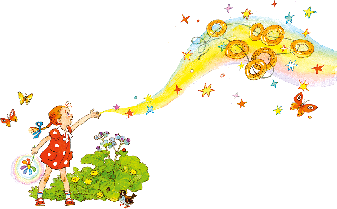 Ничего, не плачь, я тебе помогу. Правда, баранок у меня нет и денег тоже нет, но зато растёт у меня в садике один цветок, называется цветик-семицветик, он всё может. Ты, я знаю, девочка хорошая, хоть и любишь зевать по сторонам. Я тебе подарю цветик-семицветик, он всё устроит.