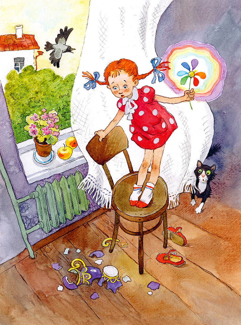Женя была совсем небольшая девочка, поэтому она влезла на стул и потянулась за любимой маминой вазочкой, которая стояла на самой верхней полке.