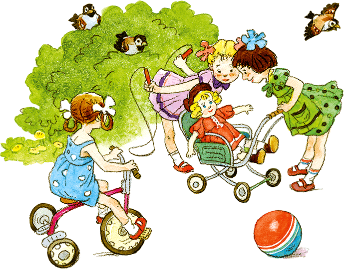 Женя обиделась и решила больше с мальчишками не водиться, а пошла на другой двор водиться с девочками. Пришла, видит у девочек разные игрушки. У кого коляска, у кого мячик, у кого прыгалка, у кого трёхколёсный велосипед, а у одной большая говорящая кукла в кукольной соломенной шляпке и в кукольных калошках. Взяла Женю досада. Даже глаза от зависти стали жёлтые, как у козы.